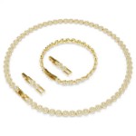 Harmonizing luxury throughout your style, this gold-tone plated set was born to shine. Each piece features a full surround of round-cut crystals, each framed by a halo of clear pavé. This includes the dainty motifs on both the necklace and the bracelet. The foldover clasps deliver a seamless closure, while the additional extenders mean you can adjust the jewelry for both comfort and size. Wear these pieces together whenever you need a look of all-over glamour.